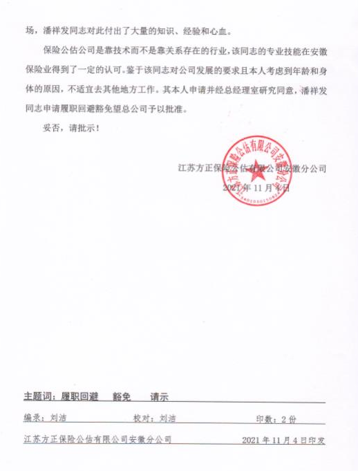 根據(jù)安徽銀保監(jiān)局銀保監(jiān)發(fā)(2020)50號文《中國銀保監(jiān)會關(guān)于銀行保險機構(gòu)員工履職回避工作的指導意見》以及安徽銀保監(jiān)局專題會議精神(專題會議紀要(2020)19號文)的要求,安徽分公司報送分公司負責人履職回避豁免申請,現(xiàn)就安徽分公司負責人潘祥發(fā)同志履職回避豁免申請事宜予以公示,公示時間:2021年11月5日—10日。