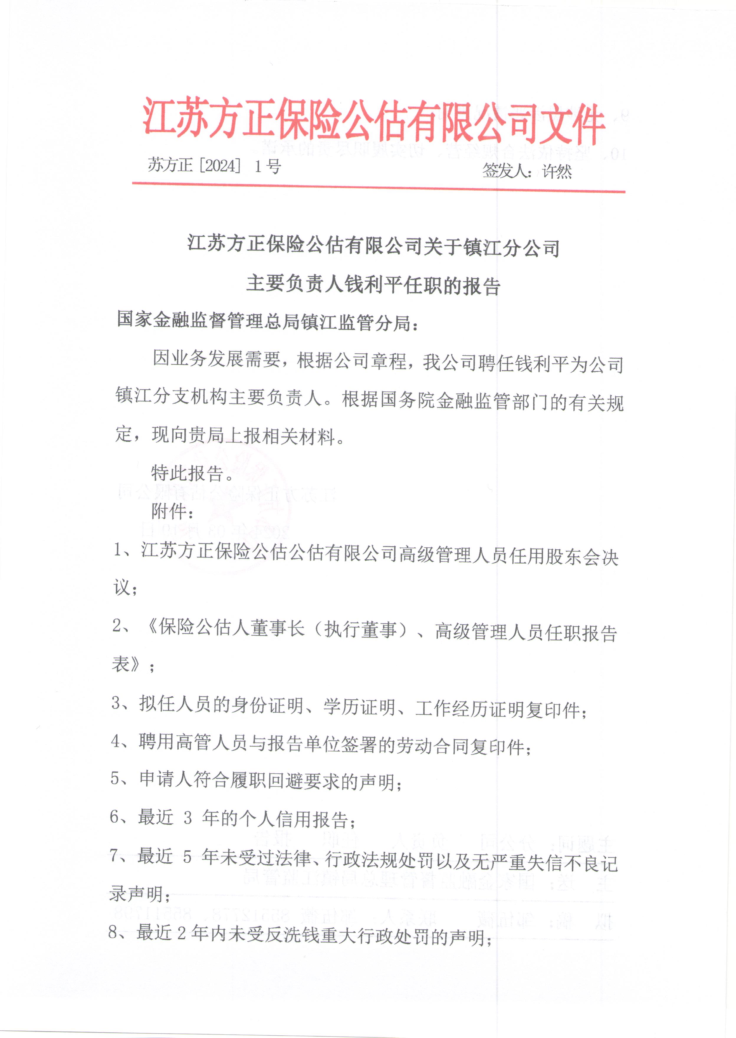 關(guān)于鎮(zhèn)江分公司主要負(fù)責(zé)人錢(qián)利平任職的公示