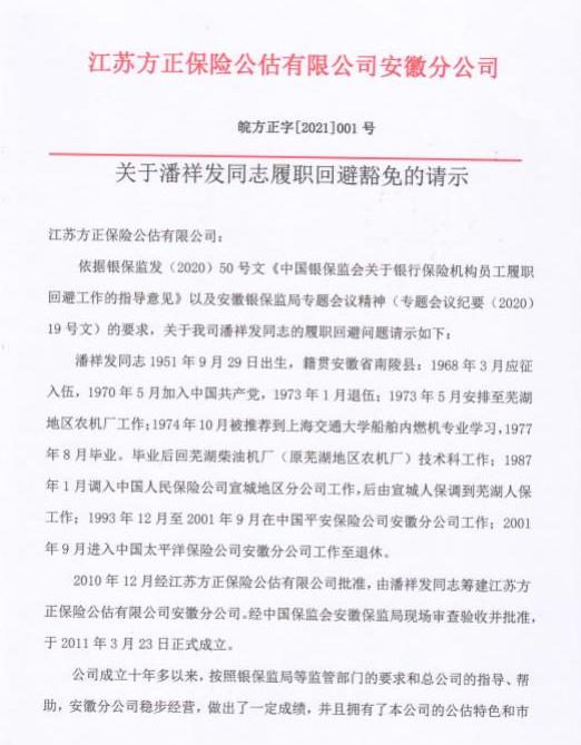 根據(jù)安徽銀保監(jiān)局銀保監(jiān)發(fā)(2020)50號文《中國銀保監(jiān)會關(guān)于銀行保險機構(gòu)員工履職回避工作的指導意見》以及安徽銀保監(jiān)局專題會議精神(專題會議紀要(2020)19號文)的要求,安徽分公司報送分公司負責人履職回避豁免申請,現(xiàn)就安徽分公司負責人潘祥發(fā)同志履職回避豁免申請事宜予以公示,公示時間:2021年11月5日—10日。